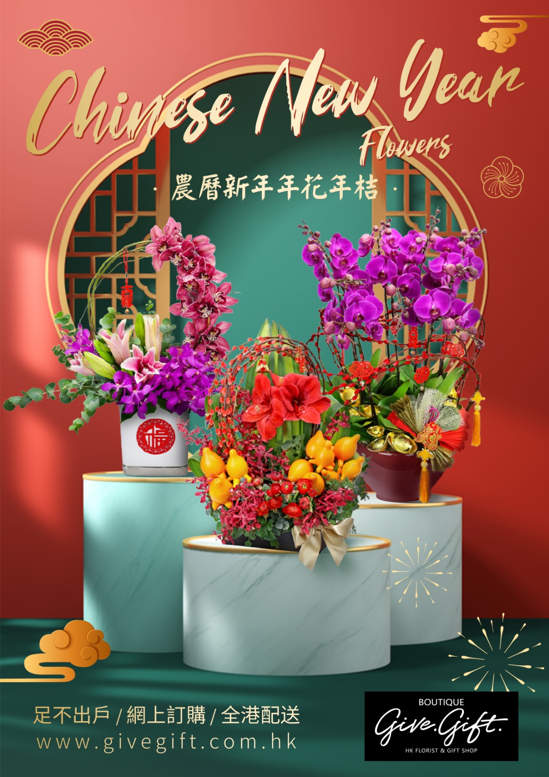 To buy spring festival flowers for Chinese New Year, many people in Hong Kong like to visit the flower market in Mong Kok. One reason is there are many flower shops with a lot of varieties; and with the same budget, you can get more flowers there. Besides, going to the Lunar New Year Fair stalls to do Spring Festival shopping and buy the CNY flower decoration is one of the traditions and customs for some Chinese. Hong Kong Lunar New Year public holiday starts from the first lunar day, if any office worker wants to choose the Chinese New Year flower on his/her own, the earliest time is on Chinese New Year's Eve, which means crowded in the flower market. Even if you go before the rush hour, it’s a torture to bring the heavy flower pots and vases back home. As online floral shopping has gained popularity in recent years, purchasing CNY floral arrangements online becomes a trend. Professional florists from Give Gift Boutique help you design the Spring Festival floral gifts with Chinese New Year theme: not only do we deliver the flower gifts to you door to door to save you time and energy; but also our delivery team will try their best to keep your CNY flower gifts in the best condition during transportation.